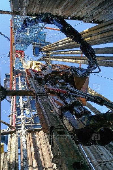 Внутреннее устройство буровой установки. Верхний силовой привод буровой установки, оборудование для спуска и подъема труб. Бурильные трубы установлены вертикально