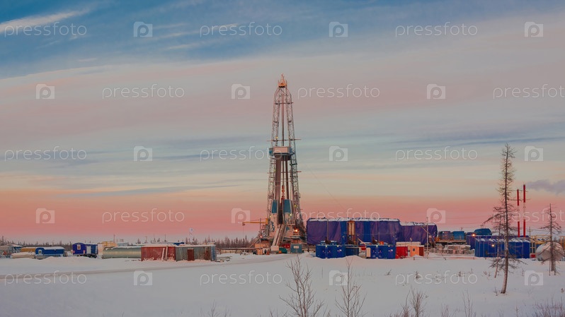Пейзаж северного ландшафта нефтегазового месторождения с буровой установкой на фоне красивого неба. Зимний полярный день