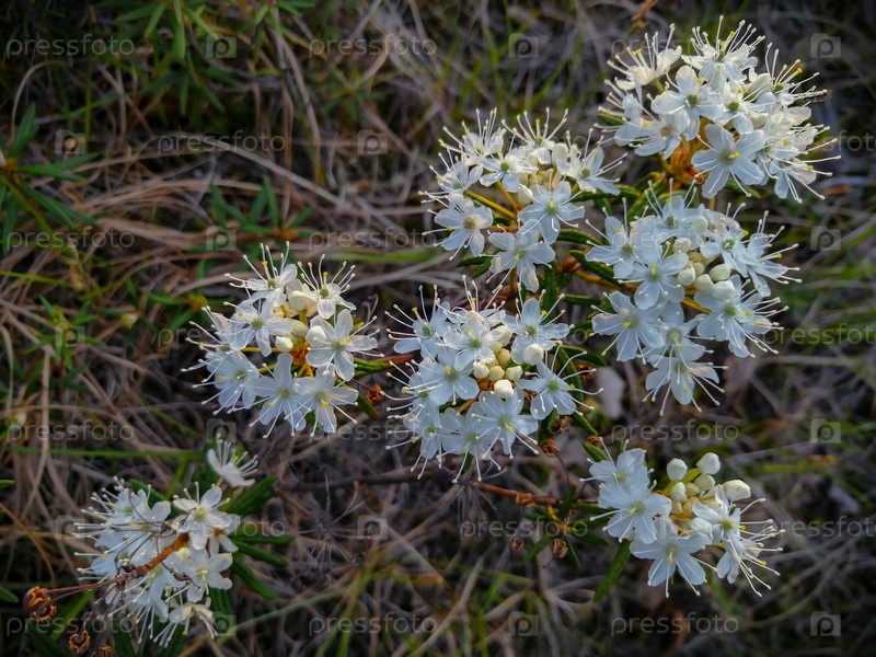 Маленькие белые соцветия кустарника багульника из семейства вересковых рода рододендронов, растущего в северной тундре. Летняя природа тундры. Уникальная полярная флора