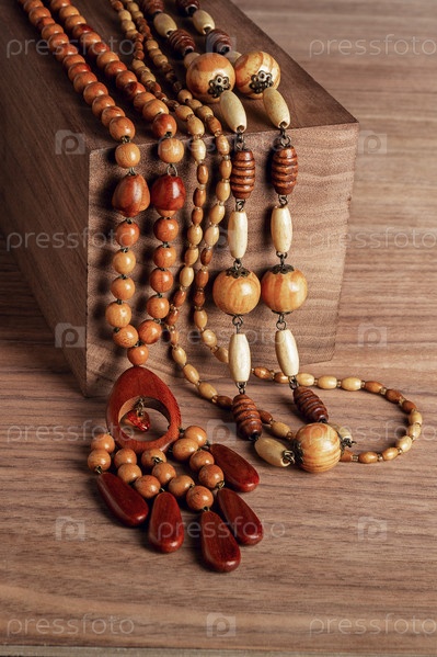 Деревянные бусы с подвеской и янтарным камнем лежат на деревянном бруске и деревянном столе. Этнический фон, украшения из натурального дерева