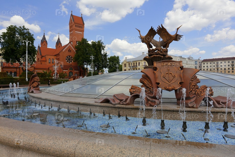Фонтан на площади Независимости на фоне костела святого Симеона и святой Елены. Минск. Беларусь. 2023. 40 Мп+