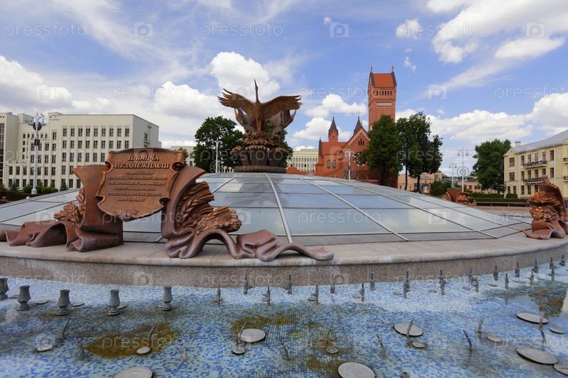 Фонтан на площади Независимости на фоне костела святого Симеона и святой Елены. Минск. Беларусь. 2023. 40 Мп+