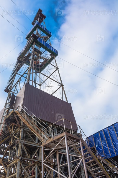Буровая установка с башней-башней. Внизу находится буровое оборудование. На северном месторождении для добычи нефти и газа бурят глубокую скважину. Летний день. Голубое облачное небо
