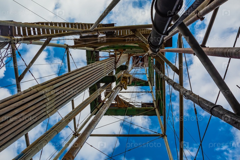 Расположение оборудования внутри буровой установки для бурения нефти и газа. Вертикальные бурильные трубы. Подъемная система. Вид снизу вверх. Голубое облачное небо
