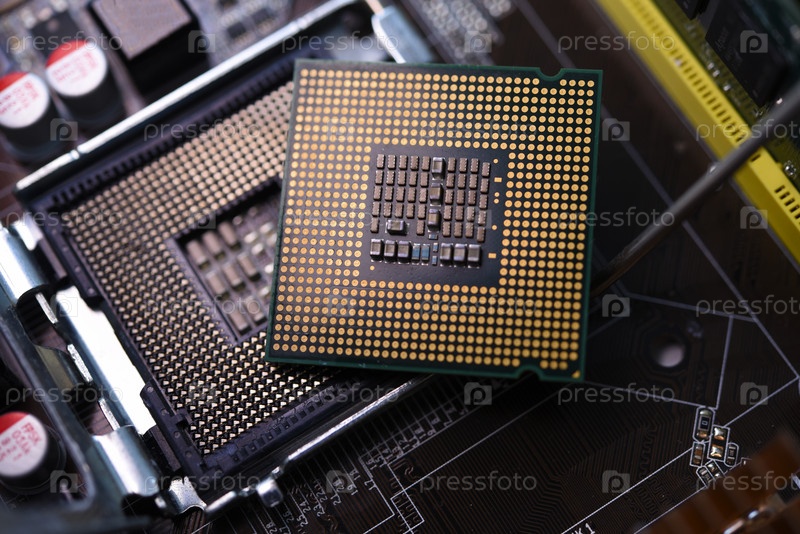 Микропроцессор и разъем на материнской плате. Компьютерные радиодетали. Микросхемы и чипы