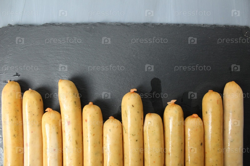 Фон из куриных сосисок, лежащих подряд крупным планом на сером фоне с местом для текста в пространстве для копирования. Барбекю
