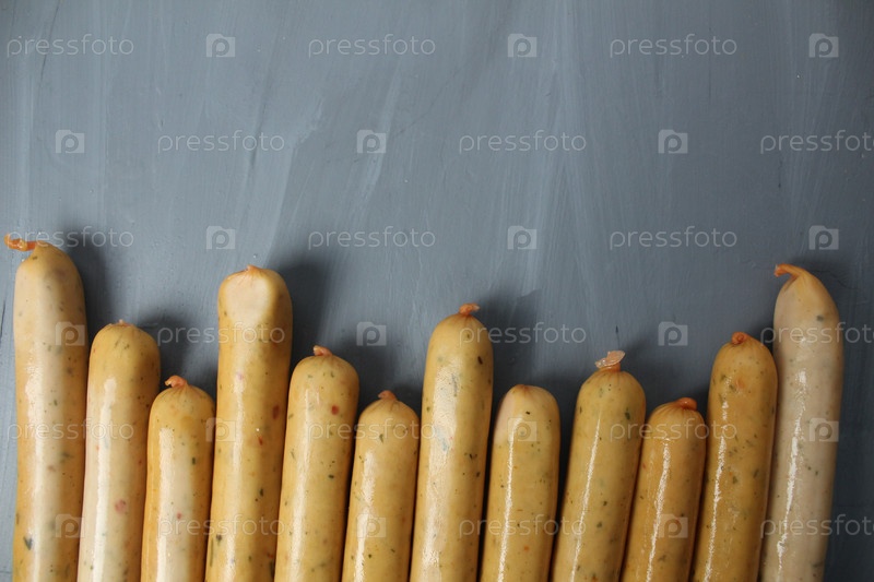 Множество колбасок-гриль лежат внизу на сером фоне с местом для текста. Свежая еда для пикника