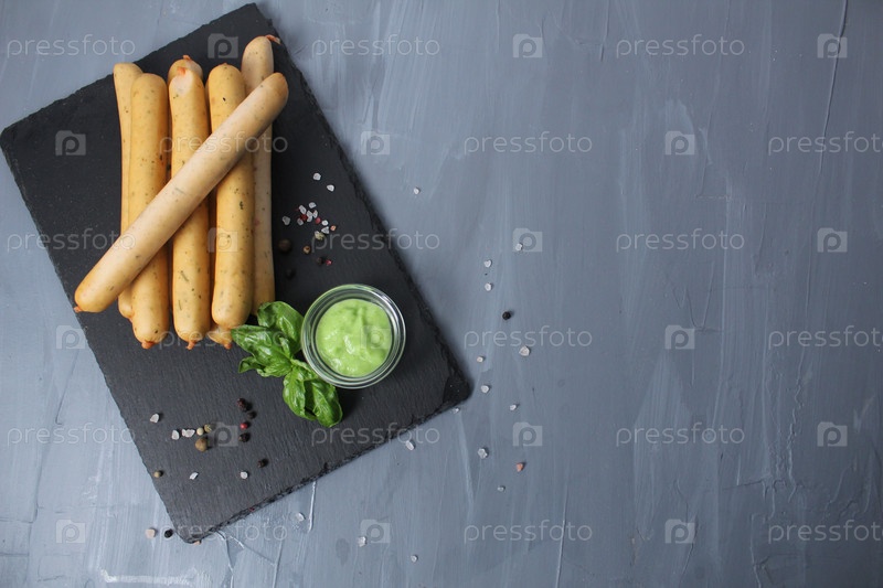 Белые натуральные здоровые правильные колбасы без красителей с перцем песто из базилика на сером фоне с местом для копирования текста. Рецепт колбасы