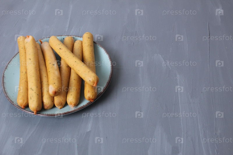 Натуральные куриные колбаски лежат в тарелке на сером фоне. Мясной день: вегетарианство