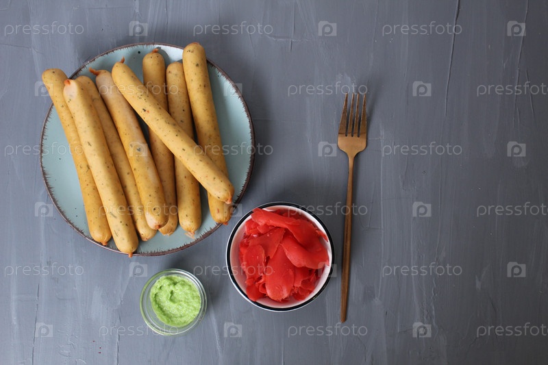 Белые колбаски с красным имбирем, зеленым соусом песто и вилкой. Обед на немецком языке. Вкусная еда