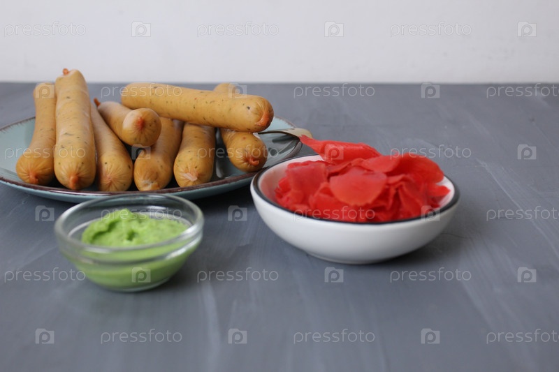 Красный маринованный имбирь и острый зеленый соус васаби. Пряные соусы к мясу на сером фоне с метками для текста в пространстве для копирования