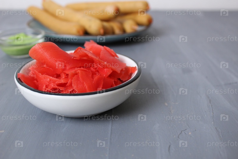 Красный маринованный имбирь в соуснике на тарелке на сером фоне. Острая еда. здоровье