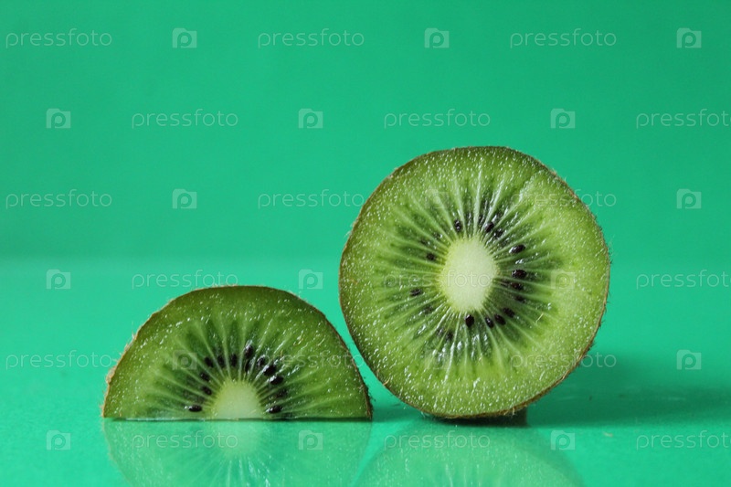 Половина и круг киви-кусрчека с отражением на зеленом фоне с копировальным пространством