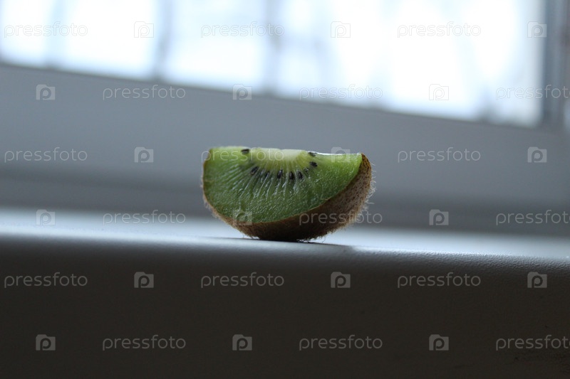Кусочек киви на подоконнике на белом светлом фоне с копировальным пространством