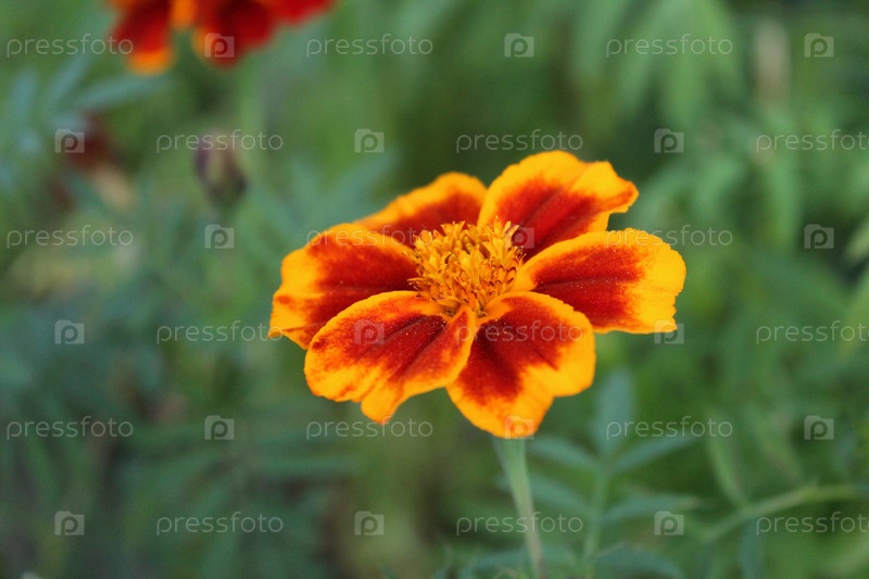 Оранжевый темно-желтый цветок календулы цветочная головка крупным планом. Летние растения на фоне зеленой травы