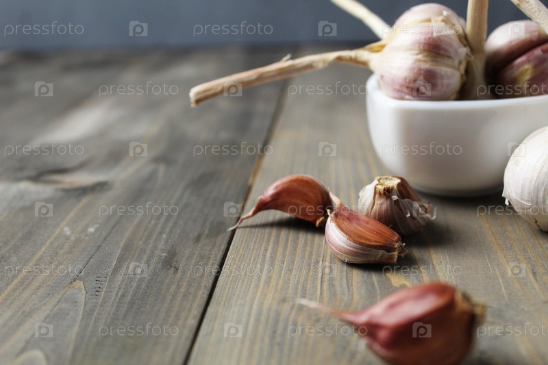 Зубчики чеснока белые фиолетовые на сером фоне в белой миске крупным планом с местом для копирования текста
