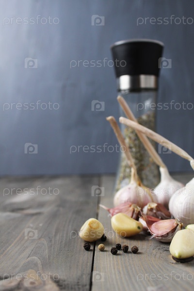 Очищенный чеснок и головки белого фиолетового чеснока на сером полу с местом для текста солонки