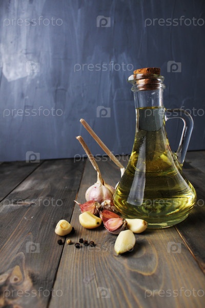 Ароматное растительное масло с чесноком и черным красным перцем на сером фоне с местом для копирования текста