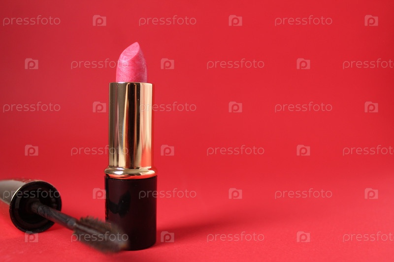 Розовая помада и кисть для глаз на красном фоне с местом для копирования текста. Современный макияж