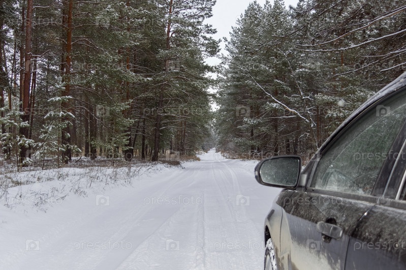 Отражение лесной дороги в зеркале автомобиля