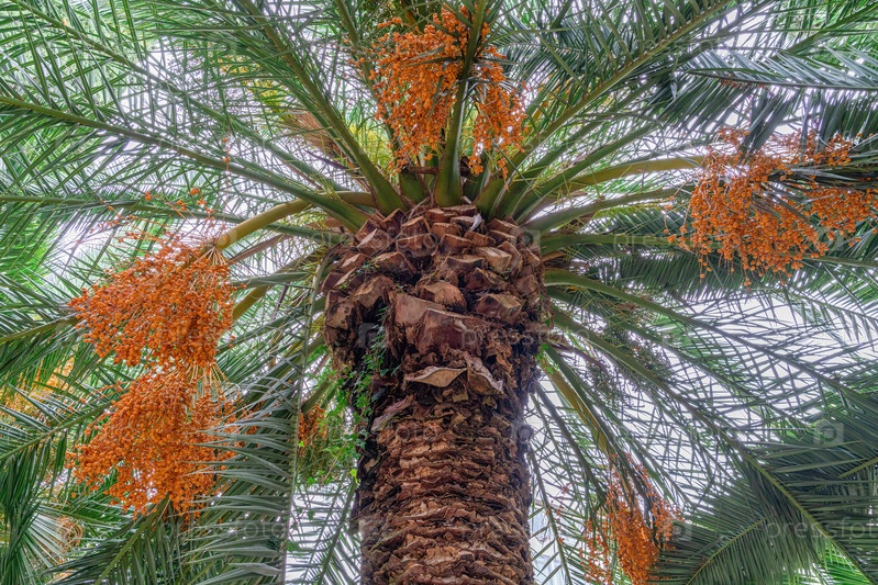 Финиковая пальма со спелыми финиками на фоне голубого неба