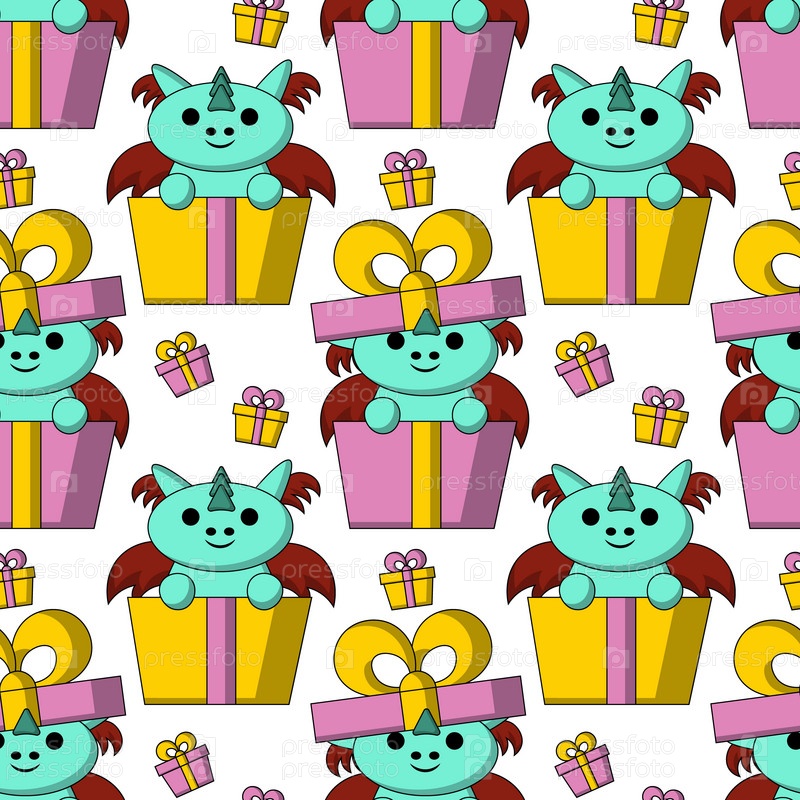 Бесшовный узор с милым драконом с подарочной коробкой