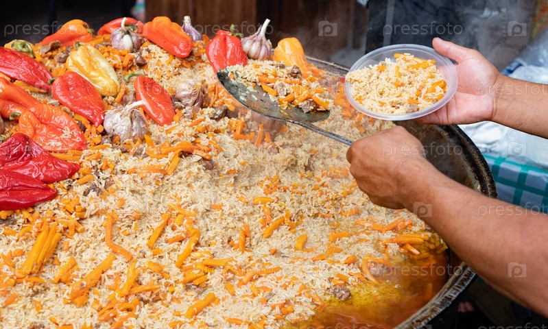Повар кладет горячий вкусный плов из казана в пластиковую тарелку. Азиатская уличная еда