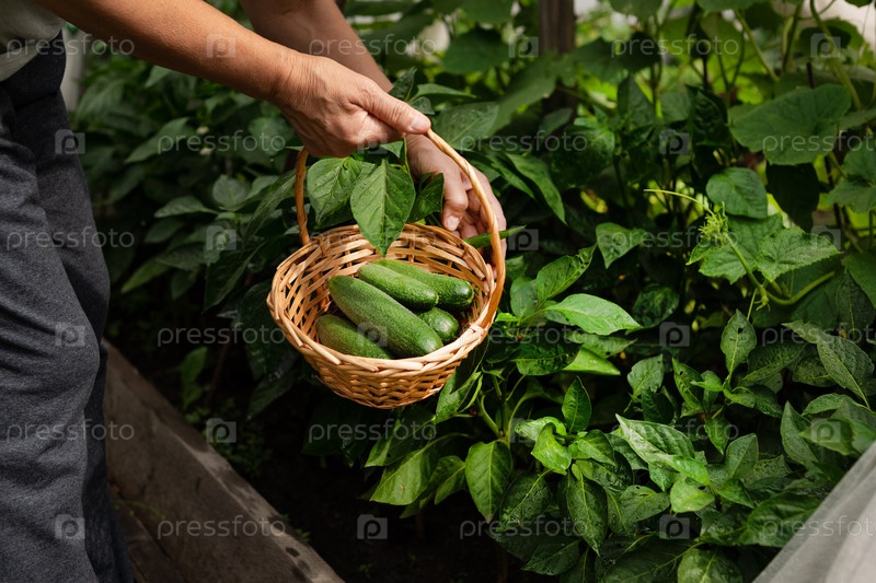 Рука выбирает огурец. Сбор урожая. Хороший урожай, Удобрение