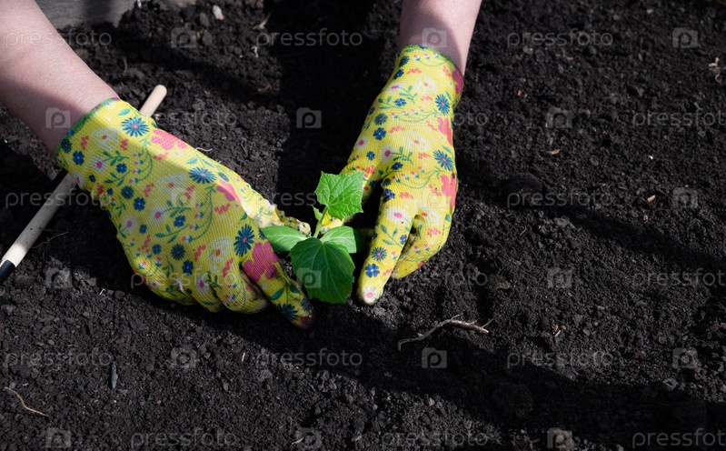 Женские руки в хозяйственных перчатках пересаживают рассаду огурцов