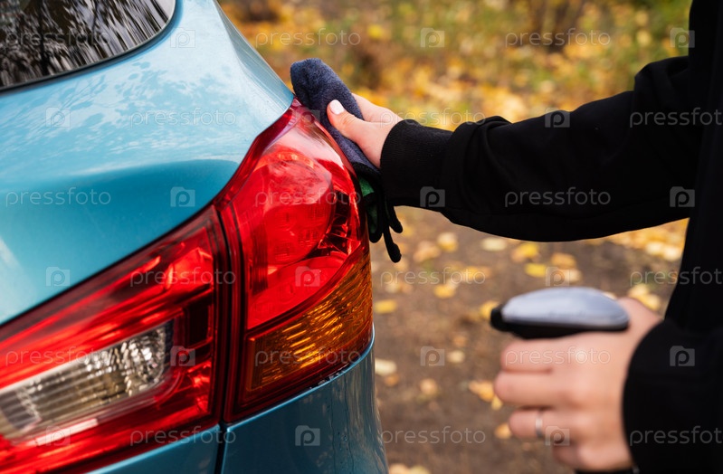 Фотография крупным планом, изображение молодой женщины, водителя, сухой протирки машины тканью из микрофибры после мытья, чистки автомобиля, окон автомобиля. Транспортное самообслуживание, концепция ухода. Защита краски