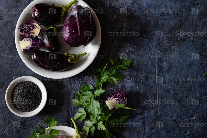 Ассортимент сырых органических фиолетовых овощей, мини-баклажанов, зеленого лука, свеклы, салата радиккио, слив, кольраби, цветочной соли на темном металлическом фоне. Вид сверху с пространством. Пищевая рамка