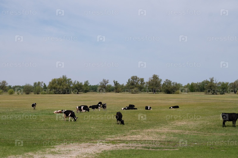 Стадо коров на летнем зеленом поле