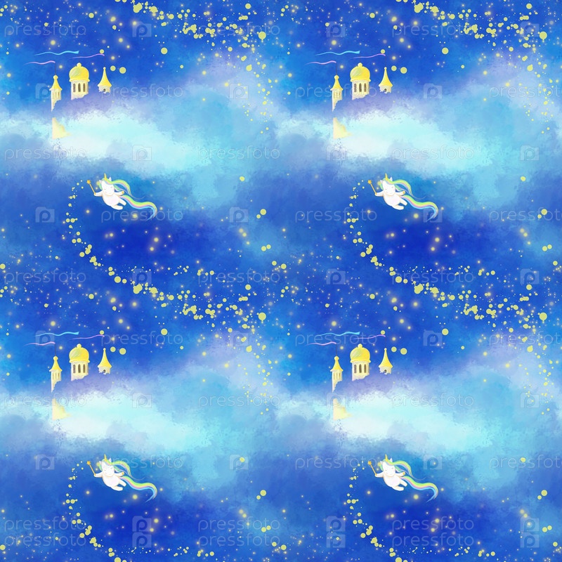 Бесшовный узор с единорогом, летящим в ночном небе и разбрасывающим звезды волшебной палочкой, нарисованная вручную иллюстрация