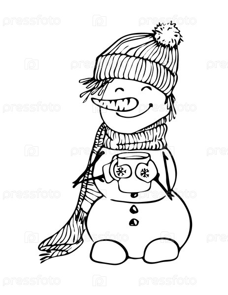 Милый снеговик в шапке и шарфе держит в руках кружку
