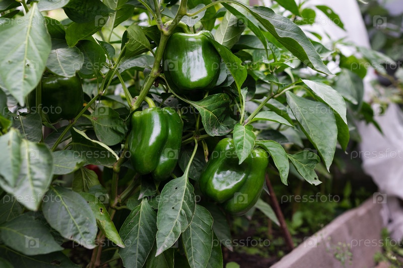 Зеленый перец в саду. Зеленый перец растет на грядке в теплице