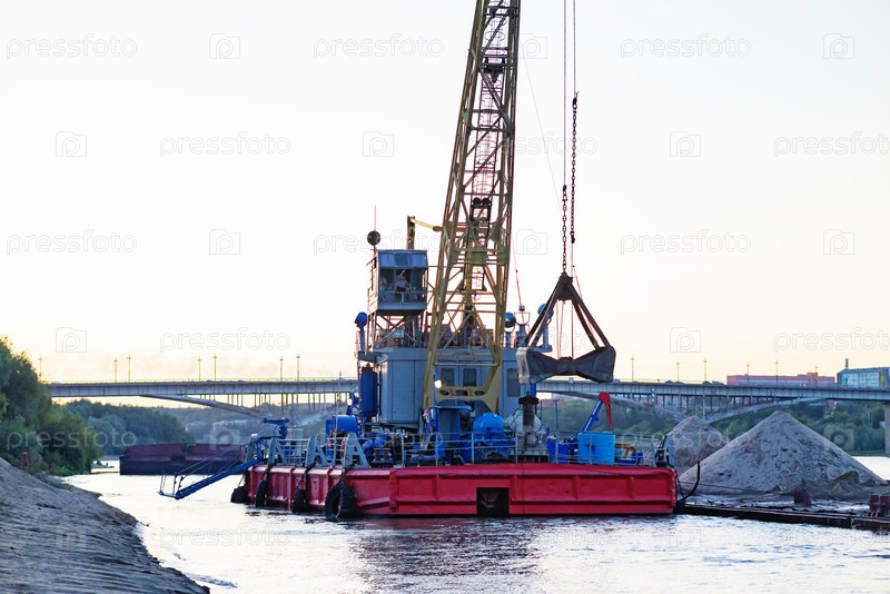 Баржа загружает песок краном. Река в горном регионе Вьетнама