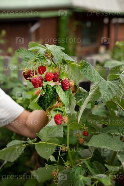 Собираем малину в саду. Женщина собирает спелую малину из кустов на открытом воздухе, крупный план. Летний сад в деревне. Выращивание ягодной культуры на ферме. Сочные спелые фрукты