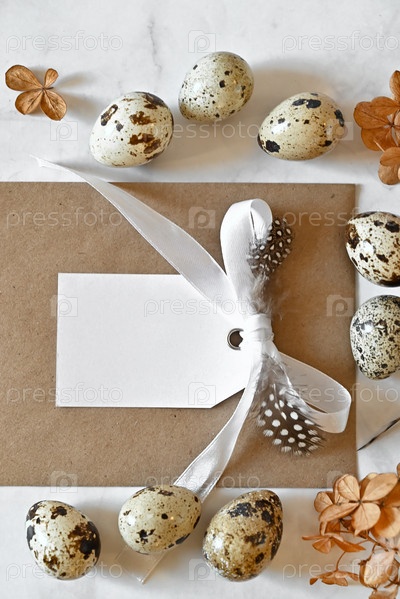Композиция с пасхальными яйцами и зелеными ветвями на бежевом фоне