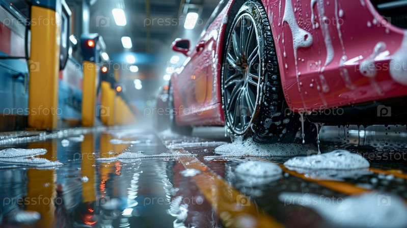 Крупный план заднего колеса розовой машины на автомойке