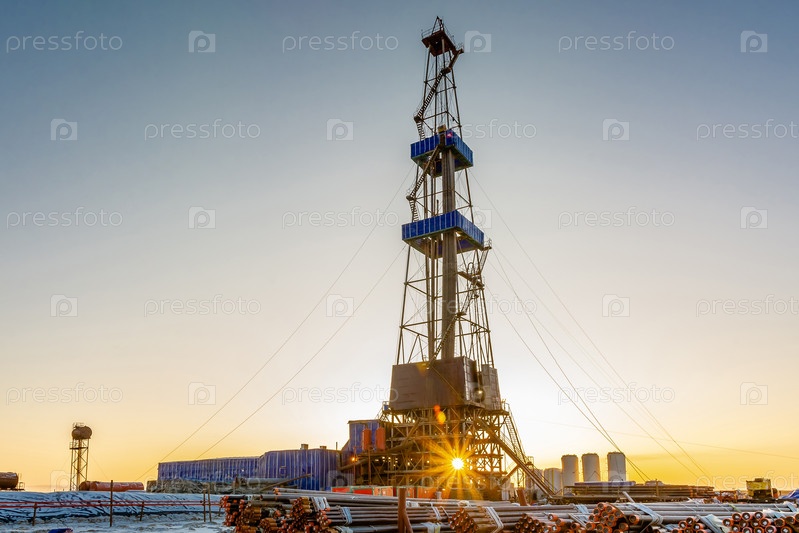 Буровая установка на нефтегазовом месторождении в Арктике. Утро полярного зимнего дня. Солнечное боке у устья скважины. Задний свет. Бурильные трубы на переднем плане