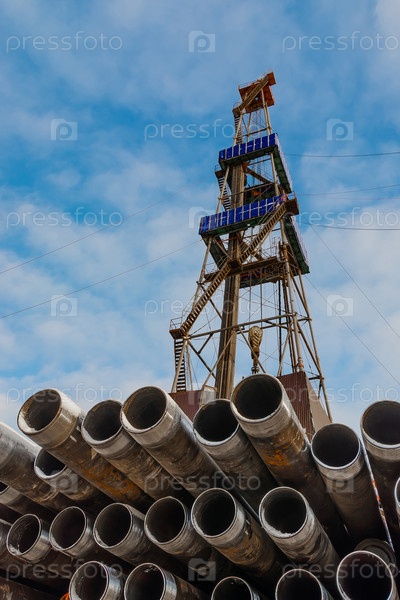 На переднем плане трубы для бурения нефтяных и газовых скважин. На заднем плане буровая установка. Голубое небо с облаками