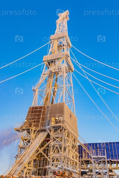Бурение на северном нефтегазовом месторождении зимой. Буровая установка покрыта снегом и освещена солнцем в полярный день. Паровые завихрения для обогрева буровой установки