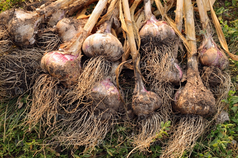 Чеснок с корнями, лежащими на садовой траве. Сбор чеснока в саду. Свежесобранные овощи, концепция органического земледелия