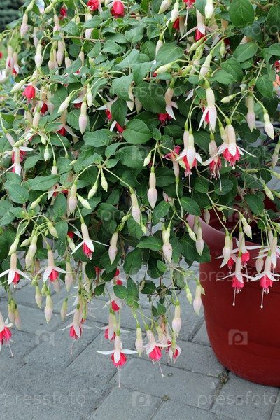 Цветущая бело-красная фуксия в пластиковом горшке на мощеном тротуаре