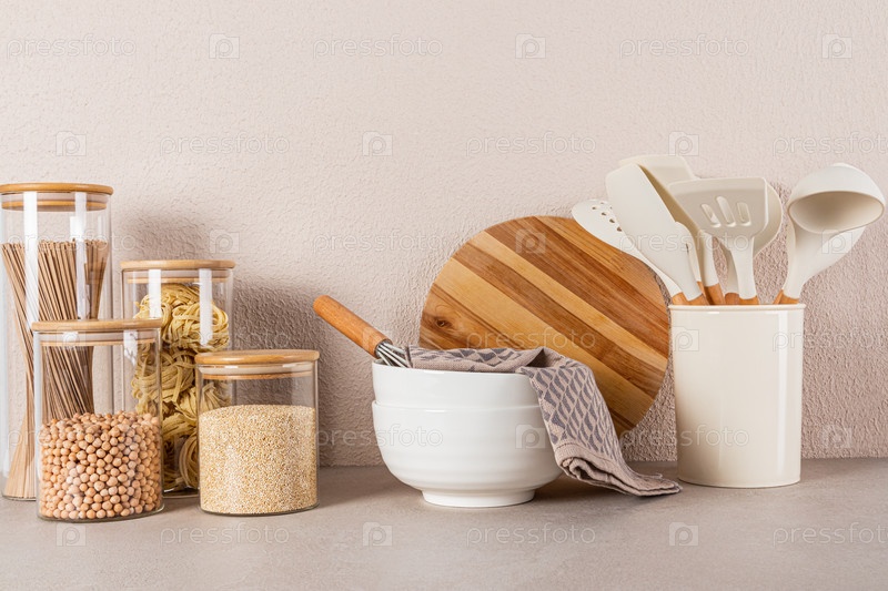 Две большие керамические миски, набор сыпучих баночек для еды, набор кухонных принадлежностей на каменной столешнице. Красивый кухонный фон. Передний план. Эко кухня