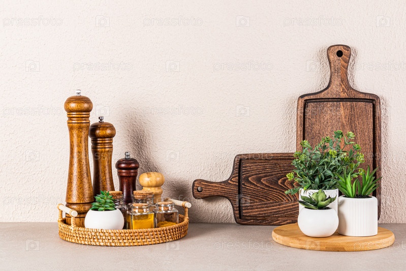 Набор деревянных мельниц для специй и стеклянных банок со специями на круглом плетеном подносе на каменной столешнице в интерьере современного кухонного пространства