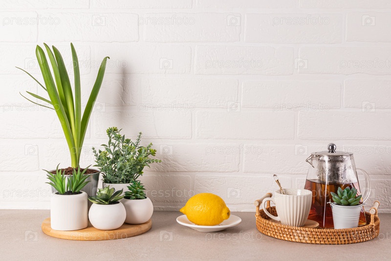 Предметы чайной церемонии, установленные на кухонной каменной столешнице с горшечными растениями на стене из белого кирпича. Копировальное пространство. Кухня фон