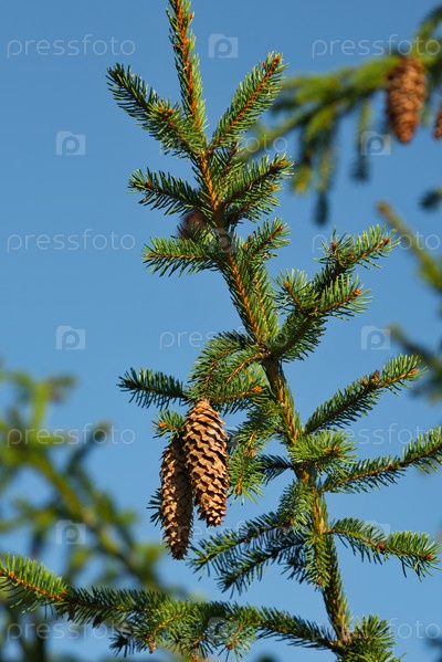 Московская область. Россия. Множество шишек на верхушке ели в историческом комплексе Гремячий Ключ