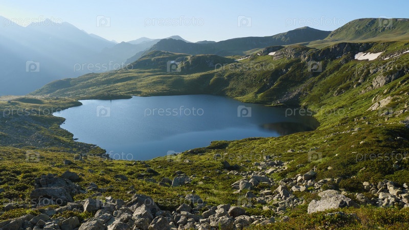 Красивое голубое озеро в горах. Берег покрыт зеленой травой. Утро, силуэты горных вершин на заднем плане. Кинематографическое голубое горное озеро в живописной местности