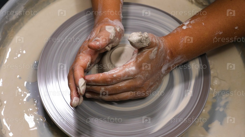 Крупный план женских рук, окрашенных глиной. Работа за гончарным кругом в гончарной мастерской. Процесс изготовления керамической посуды. Понятие ремесла, искусства и ремесла